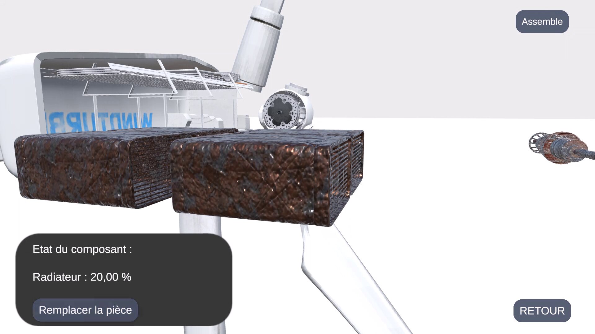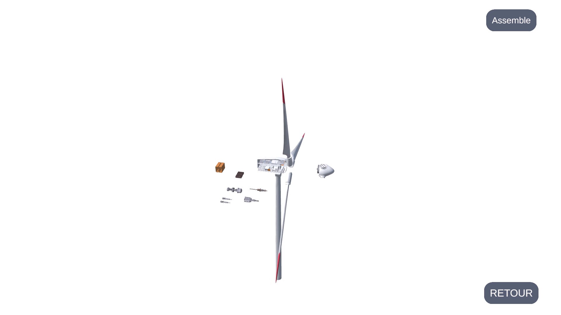 Chaque éolienne peut être analysée individuellement via une vue éclatée, permettant d’identifier les composants, de visualiser leur état et d’intervenir en cas de défaillance.