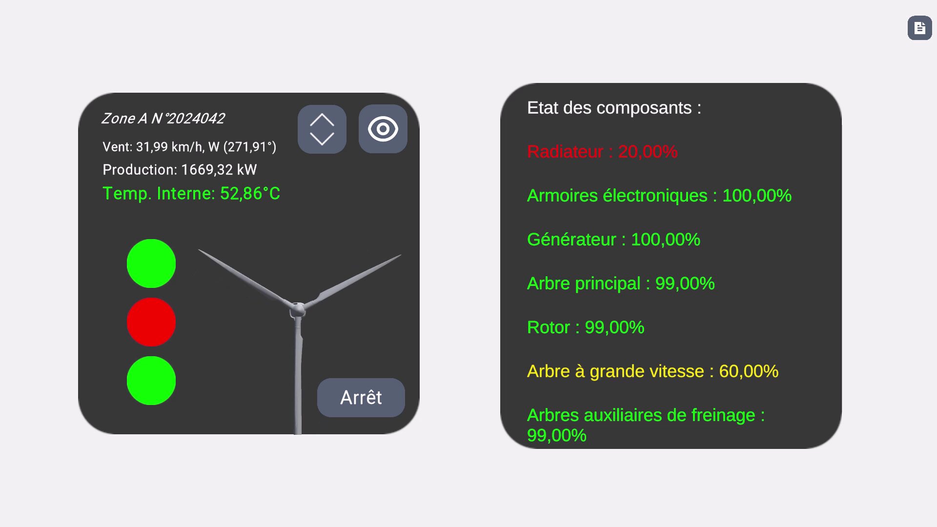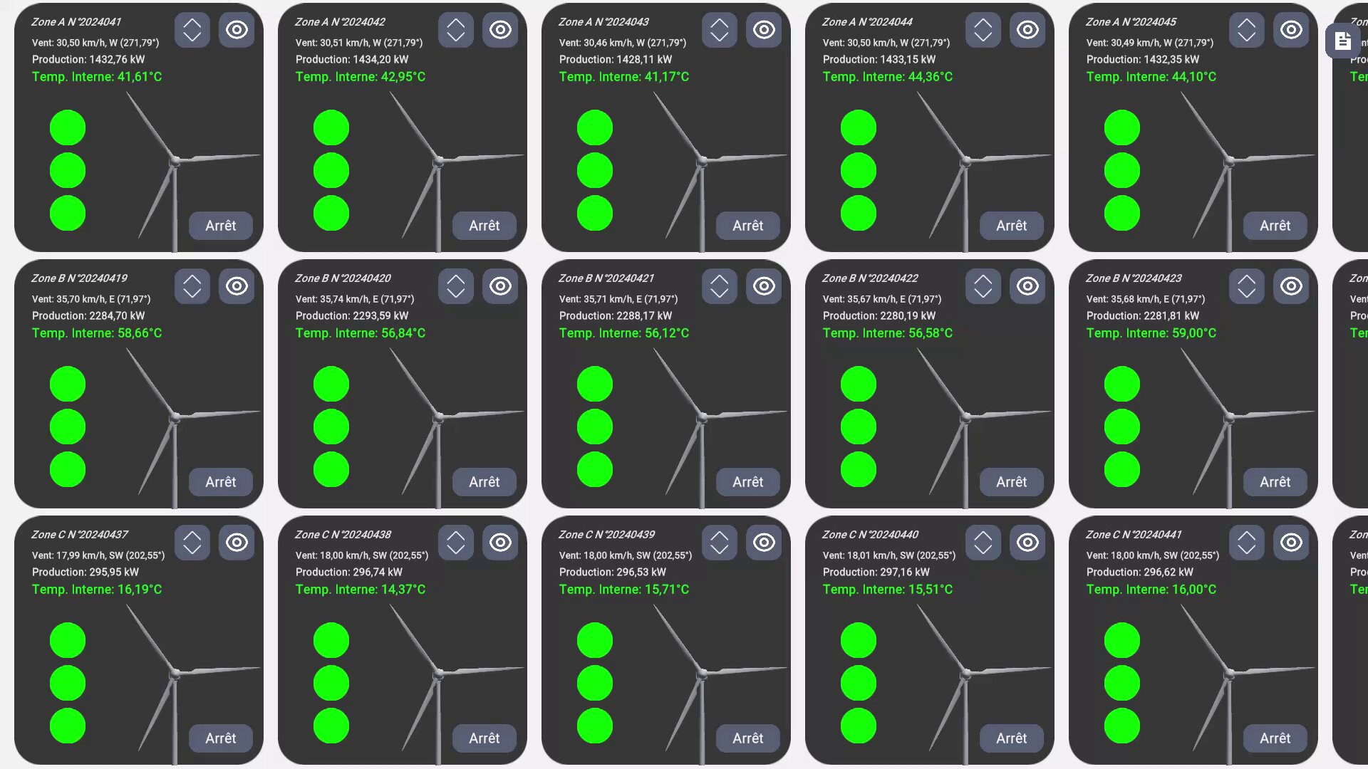 L’utilisateur dispose d’un panneau de contrôle offrant une vision globale du parc, avec des indicateurs d’état pour chaque éolienne ainsi que des données comme la vitesse du vent, sa direction et la production.